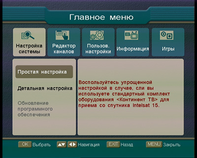 Сделать это достаточно легко. Сначала нужно выбрать антенну с конвертором. Это может быть антенна размером в 0,6м, 0,75 м, 0,8 м, 0,85 м, 0,9 м. Дальнейшие действия проводятся по инструкции, предполагающей детальную настройку телевидения Континент ТВ, с соблюдением заводских настроек, а также ряд важных условий*: